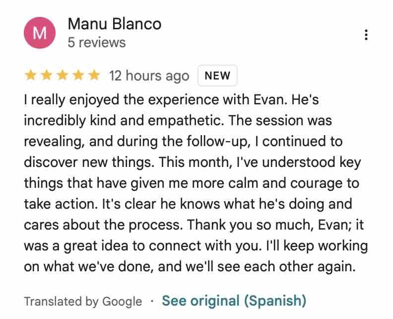 “The therapy with Evan helped me a lot in understanding the way I was operating on certain issues, finding answers to questions I constantly asked myself, and in freeing myself from habits that were holding me back and moving forward. He was by my side throughout the process, very positive, consistent, supportive, generous. I felt very comfortable, as if we had known each other for years and I thank him very much 🙏 for the whole experience!